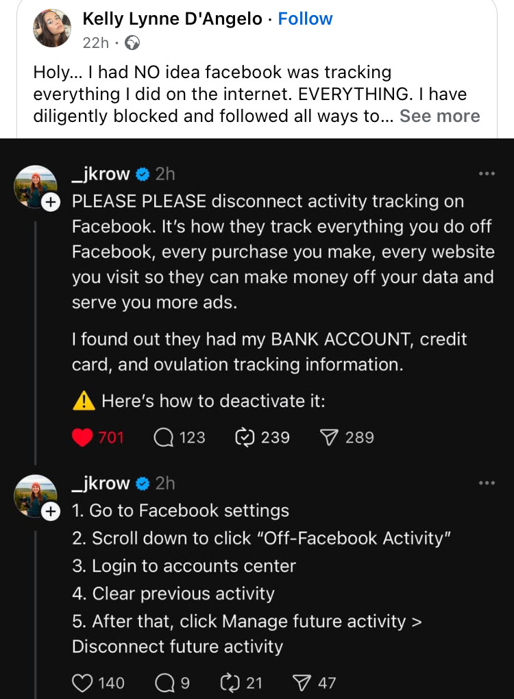 2. I disconnected activity tracking on Facebook and Instagram. If you use Meta Business or have that thing activated where your stories get posted on both IG and Facebook, then it's enough to do it on one app and it will automatically apply to the other. If not, you will have to do it separately for both apps. The photo below describes the steps if you decide to do this.